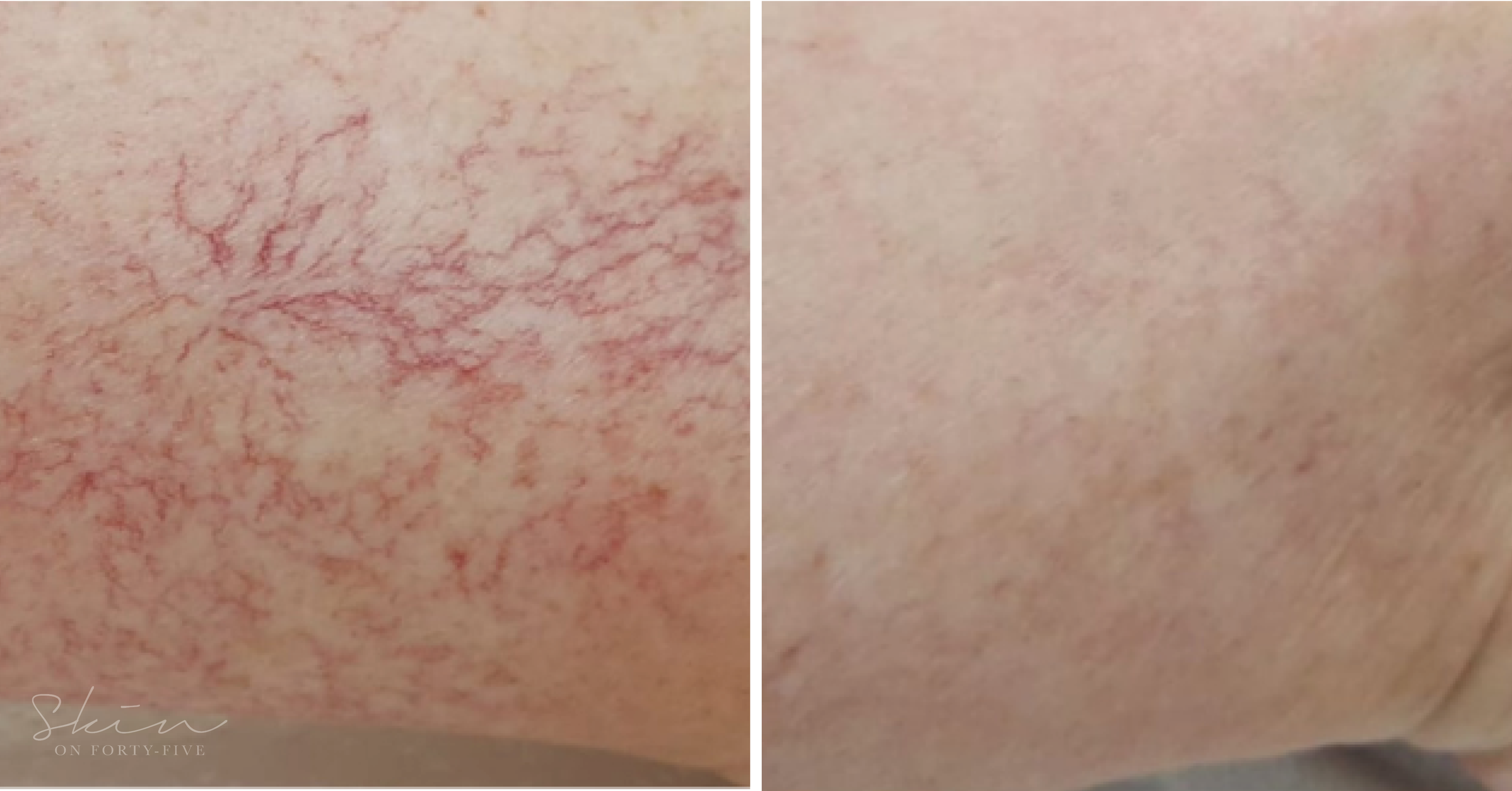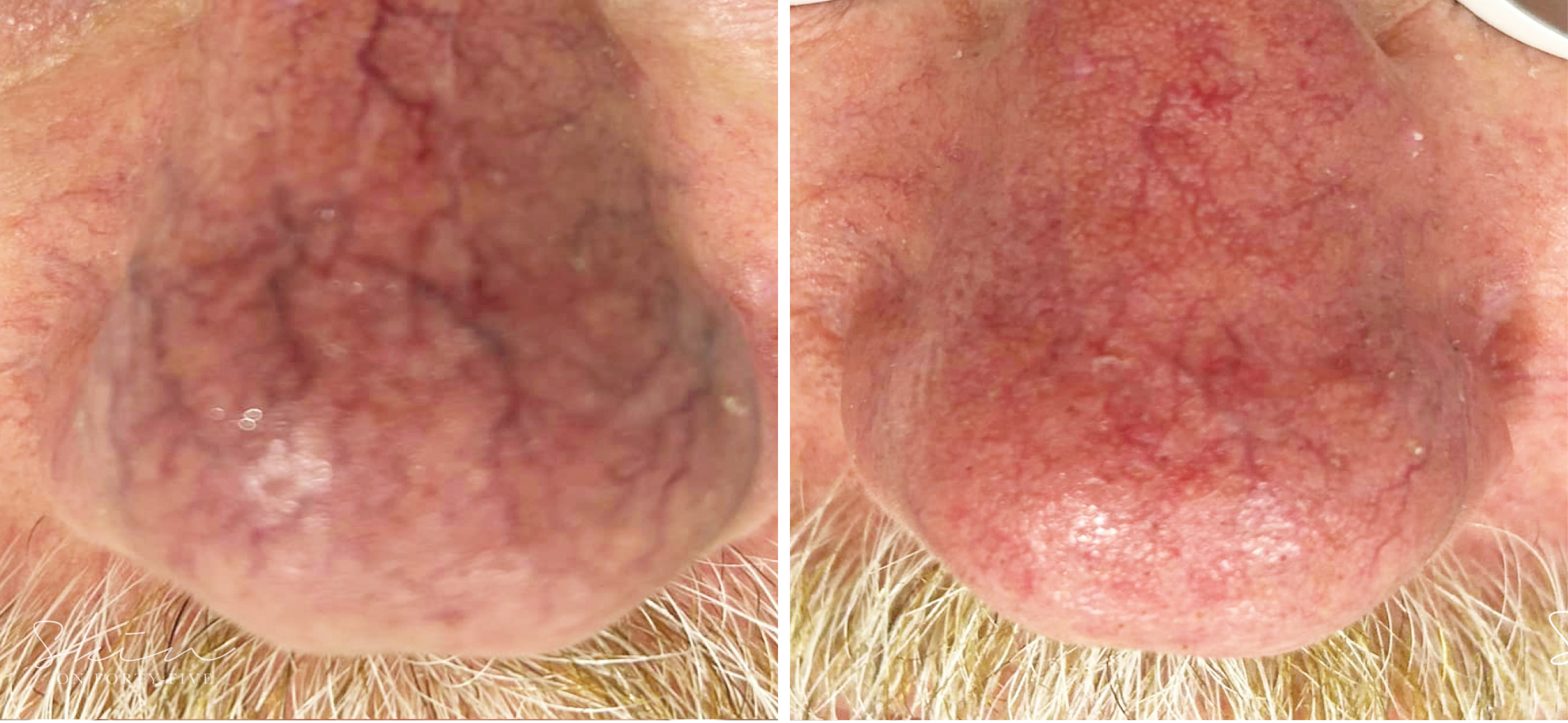 Yag Laser therapy for facial telangiectasia is not only gold standard, but also quick and effective. Skin on Forty-Five's Cutera Yag laser delivers pulses of light energy into the selected veins, which target the haemoglobin in red blood cells without causing any damage to surrounding tissue. The thermal energy causes the blood within the vein to coagulate and destroys the lining of the small abnormal blood vessels, which go on to be reabsorbed by the body.
